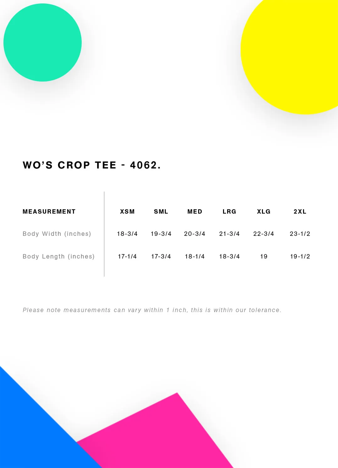 Short body, dropped shoulders, neck ribbing, side seamed, shoulder to shoulder tape, double needle hems, preshrunk to minimize shrinkage.